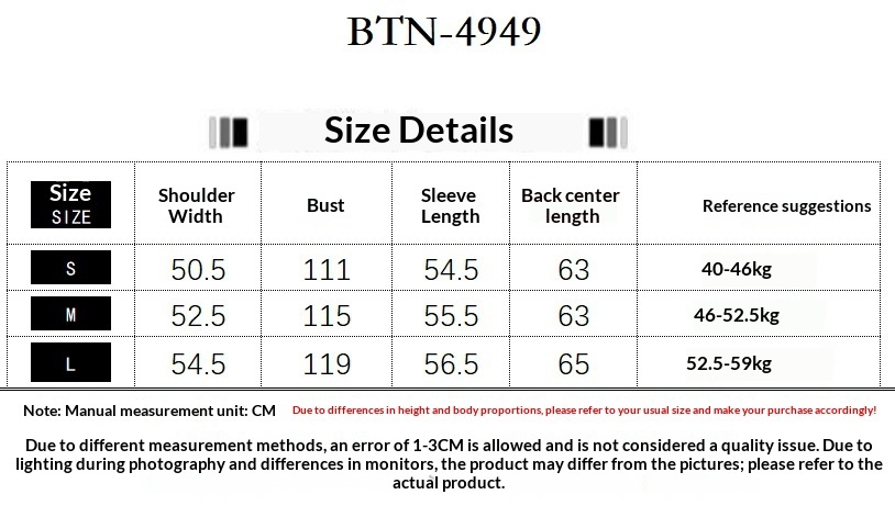1. Asian sizes are 1 to 2 sizes smaller than European and American people. Choose the larger size if your size between two sizes. Please allow 2-3cm differences due to manual measurement. 2. Please check the size chart carefully before you buy the item, if you don't know how to choose size, please contact our customer service. 3.As you know, the different computers display colors differently, the color of the actual item may vary slightly from the following images.